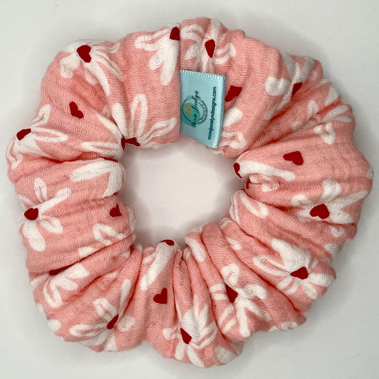 Part of our Valentine's Collection, 'Romy' is pink with red hearts and white flowers throughout the fabric. These scrunchies add a lovely, feminine flair to any updo! Crafted with a wider elastic for extra hold, they’re both stylish and functional, making them an ideal gift. Each scrunchie is about 4 inches in diameter.